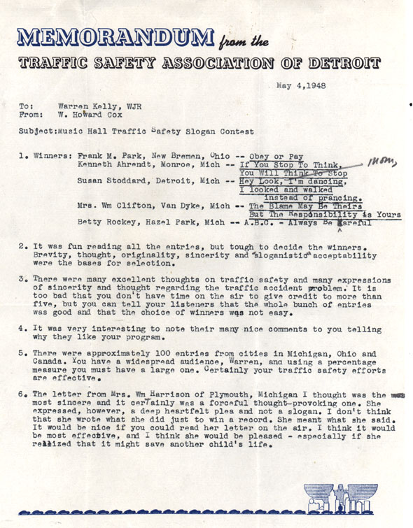 I came across a whole pile of papers from the Traffic Safety Association in the office paper dumpster last year. This ones my favorite. Hopefully its readable and pretty self-explanatory, but here are the basics: its a memo dated May 4, 1948 to radio station WJR. The two institutions had teamed up to hold a contest. The five lucky radio listeners who came up with the best traffic safety slogans were apparently awarded records.