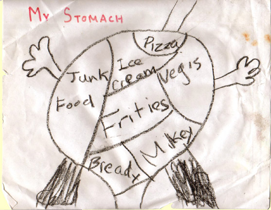 This kid eats a lot of junk food, and thats not even counting the separate junk food category. Maybe the stomach, with its grabbin arms and elephant legs, is the one making the meal choices here. I can see how a stomach with hands might scare a small child; so I really dont blame the kid for letting the thing eat whatever the hell it wants, be it pizza or vegis or... or...